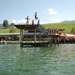 As instalações da praia no Puttererseehof incluem guarda-chuvas. Local oferece atividades esportivas, como windsurf, canoagem e caminhada.